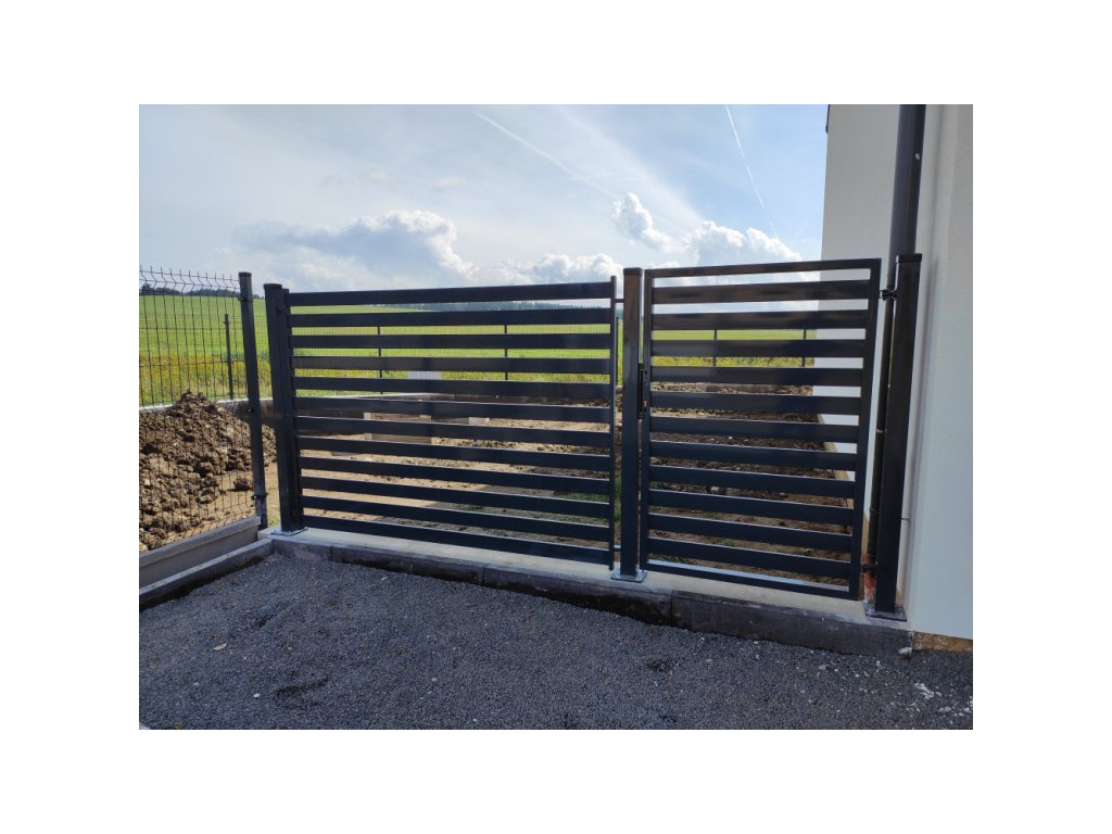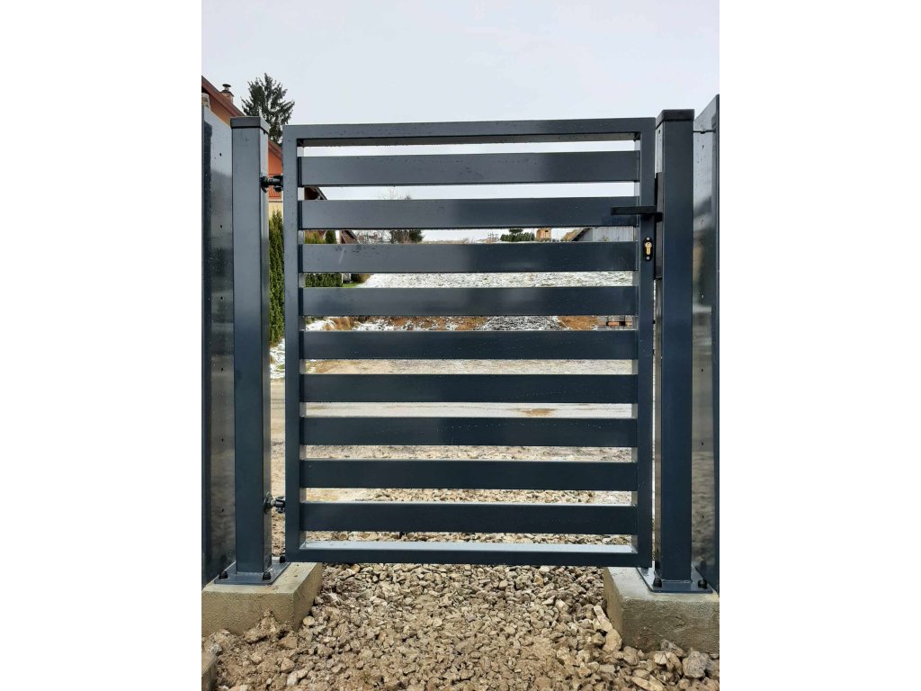 Výplň tvoria pozinkované lamely 80×20 mm, ktoré poskytujú dostatok súkromia, no zároveň pôsobia vzdušne a ladia s modernou architektúrou. Brána je dodávaná vrátane dvoch stĺpikov JAKL, pántov, zámku FAB a kompletného kovania. V prípade kotvenia do betónového podkladu vieme dodať stĺpiky s navarenými pätkami.