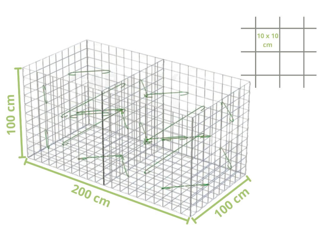 Gabiónového koše sú určené na vytváranie súvislých múrikov a plotov. Obsahuje zvárané oceľové siete a kompletné príslušenstvo na zloženie koša v tvare kocky, ktorý sa napája na susedné koše, preto neobsahuje koncovú stenu.