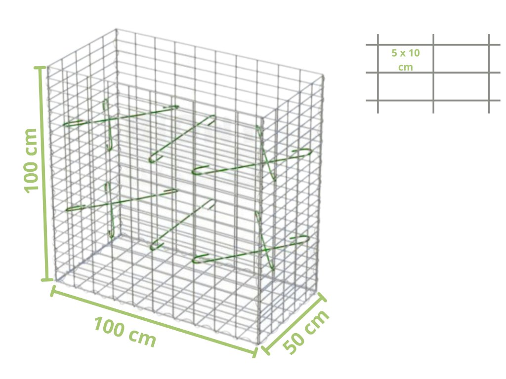 Gabiónového koše sú určené na vytváranie súvislých múrikov a plotov. Obsahuje zvárané oceľové siete a kompletné príslušenstvo na zloženie koša v tvare kocky, ktorý sa napája na susedné koše, preto neobsahuje koncovú stenu.
