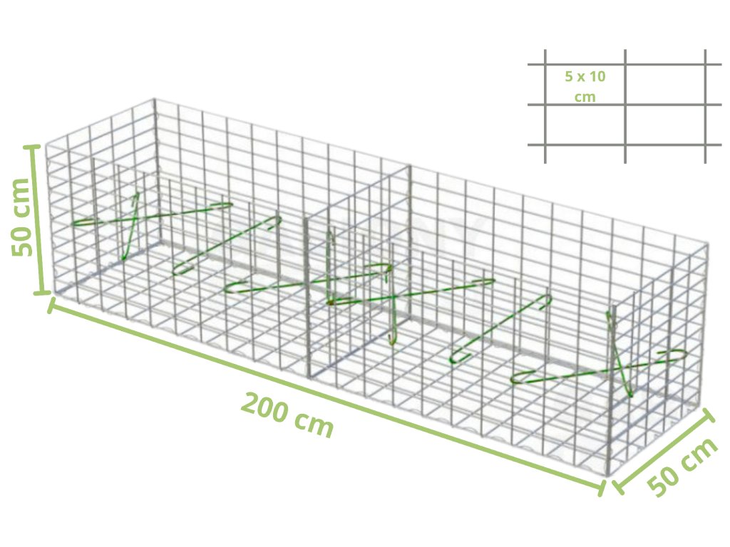 Gabiónového koše sú určené na vytváranie súvislých múrikov a plotov. Obsahuje zvárané oceľové siete a kompletné príslušenstvo na zloženie koša v tvare kocky, ktorý sa napája na susedné koše, preto neobsahuje koncovú stenu.