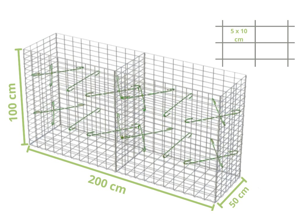 Gabiónového koše sú určené na vytváranie súvislých múrikov a plotov. Obsahuje zvárané oceľové siete a kompletné príslušenstvo na zloženie koša v tvare kocky, ktorý sa napája na susedné koše, preto neobsahuje koncovú stenu.