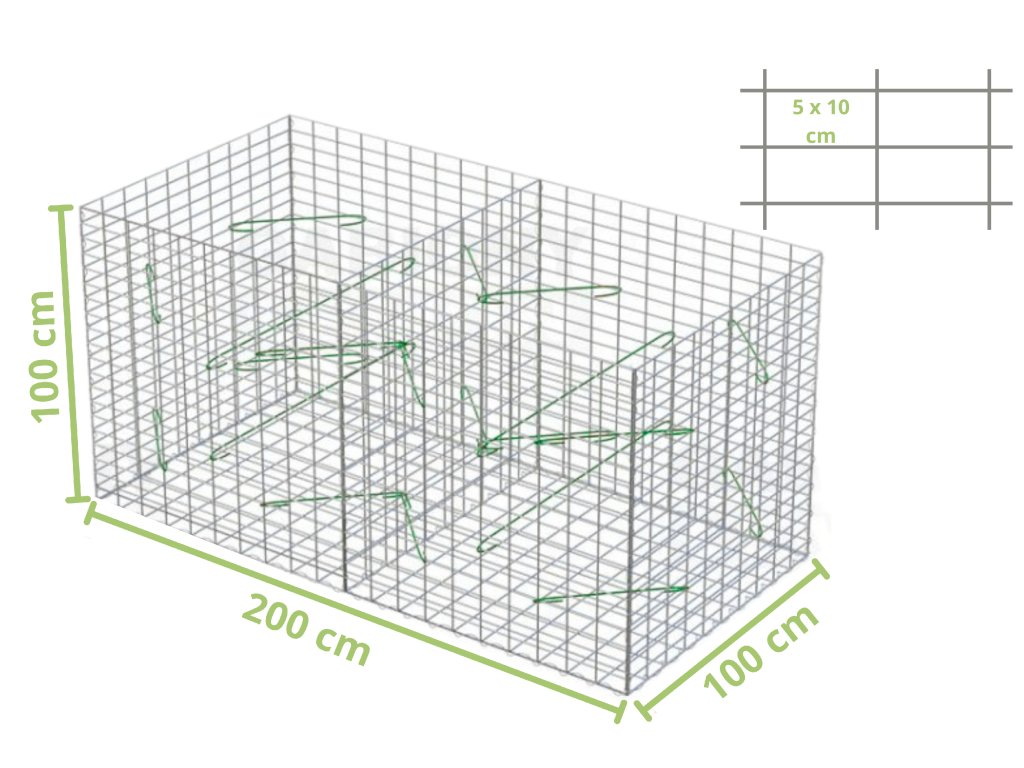 Gabiónového koše sú určené na vytváranie súvislých múrikov a plotov. Obsahuje zvárané oceľové siete a kompletné príslušenstvo na zloženie koša v tvare kocky, ktorý sa napája na susedné koše, preto neobsahuje koncovú stenu.