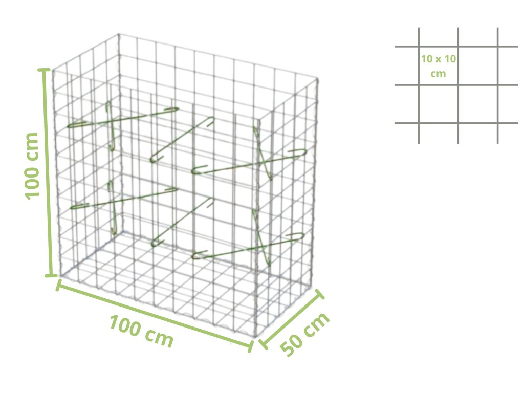 Gabiónového koše sú určené na vytváranie súvislých múrikov a plotov. Obsahuje zvárané oceľové siete a kompletné príslušenstvo na zloženie koša v tvare kocky, ktorý sa napája na susedné koše, preto neobsahuje koncovú stenu.