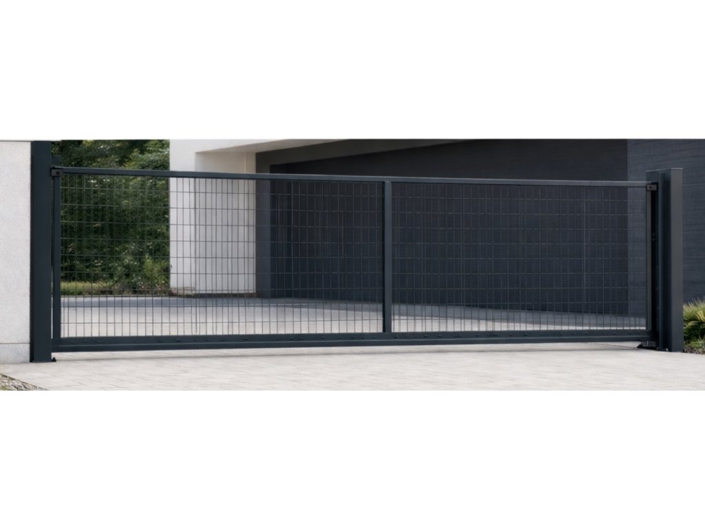Výplň tvorí pevný zváraný 2D panel, ktorý je typický vysokou tuhosťou a odolnosťou. Brána pôsobí moderne, zachováva dobrý výhľad a zároveň poskytuje bezpečné ohraničenie pozemku. Robustná oceľová konštrukcia je vhodná pre rodinné domy aj firemné areály a je pripravená aj na doplnenie automatického pohonu podľa vašich požiadaviek. Povrchová úprava zabezpečuje dlhú životnosť a odolnosť voči poveternostným vplyvom.